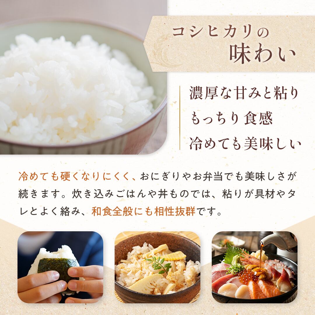 炊き上がるとツヤがあり、ふっくらとした食感。ほどよい粘りと上品な甘みが広がり、冷めてもおいしさが長持ちします。和食はもちろん、洋食やお弁当にもよく合う万能なお米です。