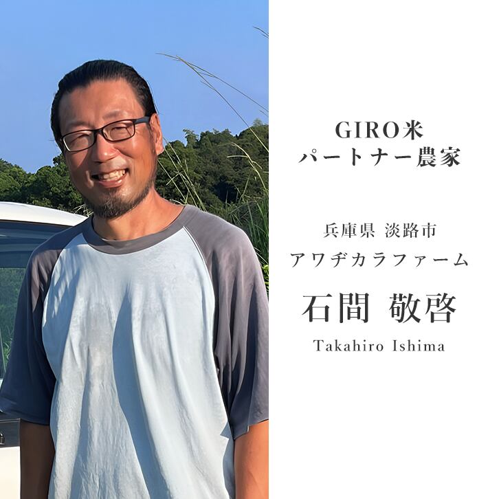 兵庫県淡路島の豊かな自然に囲まれた田園で、石間さんとGIRO米プロジェクトメンバーで丹精込めて育てた「GIRO米(旭一号)」。温暖な気候と海風に包まれた淡路島は、古くから良質なお米の産地として知られています。島の恵みと人の手が重なり合って生まれる、特別なお米です。