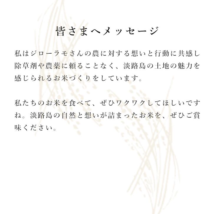 私はジローラモさんの農に対する想いと行動に共感し除草剤や農薬に頼ることなく、淡路島の土地の魅力を感じられるお米づくりをしています。