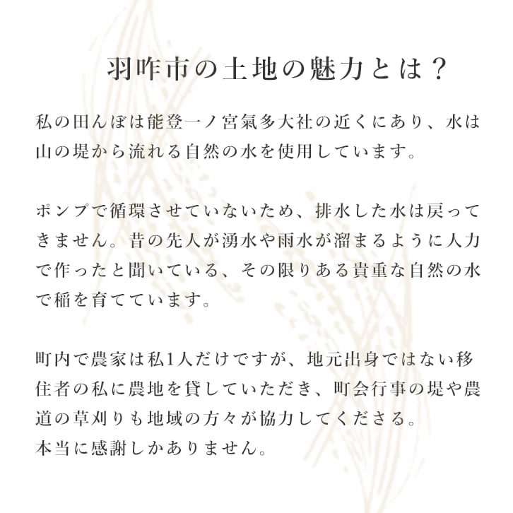 “人にも自然にも優しいお米”として、羽咋の大地から心を込めてお届けします。